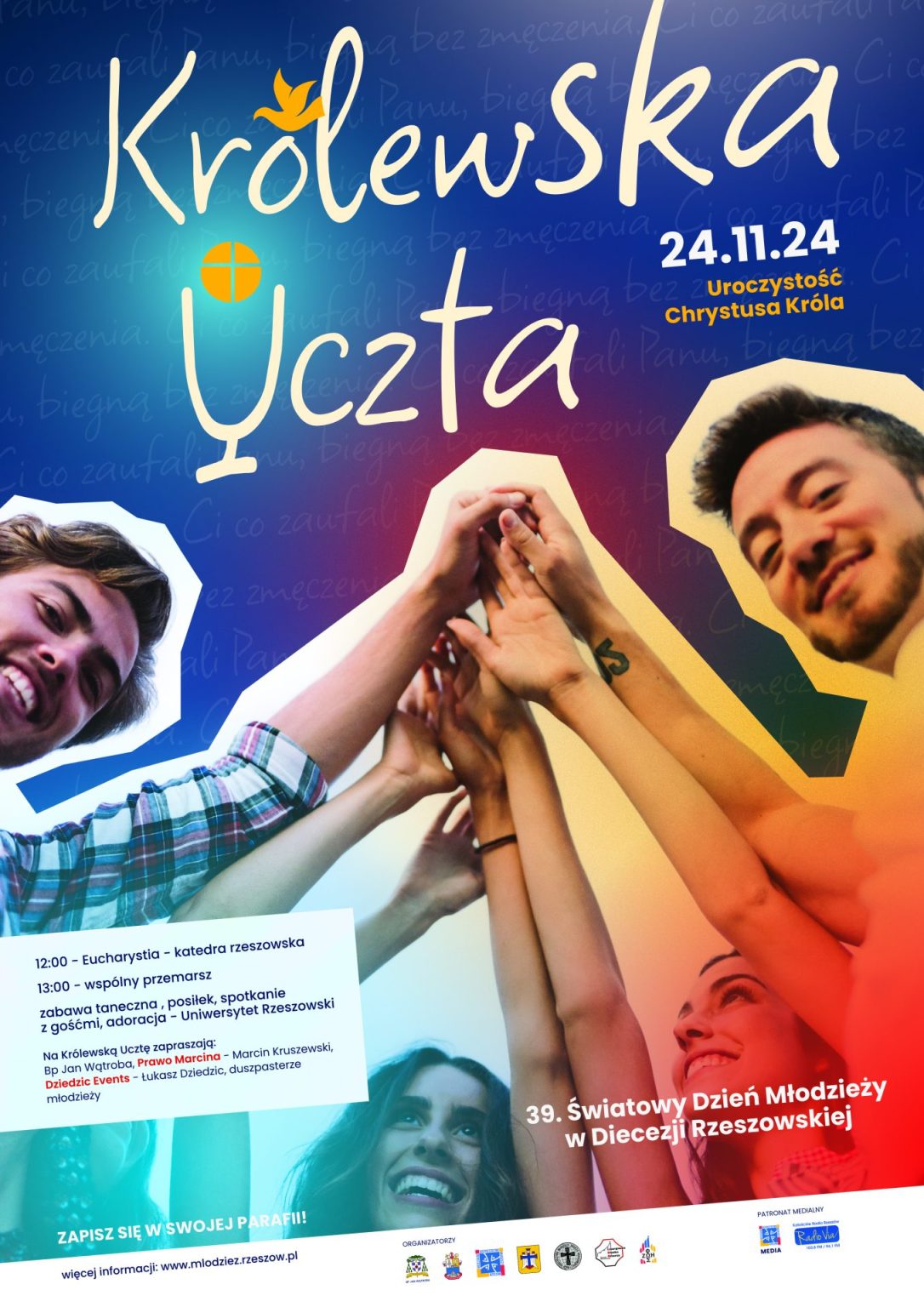 Zapraszamy na Światowy Dzień Młodzieży Diecezji Rzeszowskiej pod hasłem „Królewska Uczta” do Rzeszowa w Uroczystość Chrystusa Króla, 24 listopada 2024 r. Będzie to czas modlitwy, uwielbienia, tańca i dobrej zabawy.
